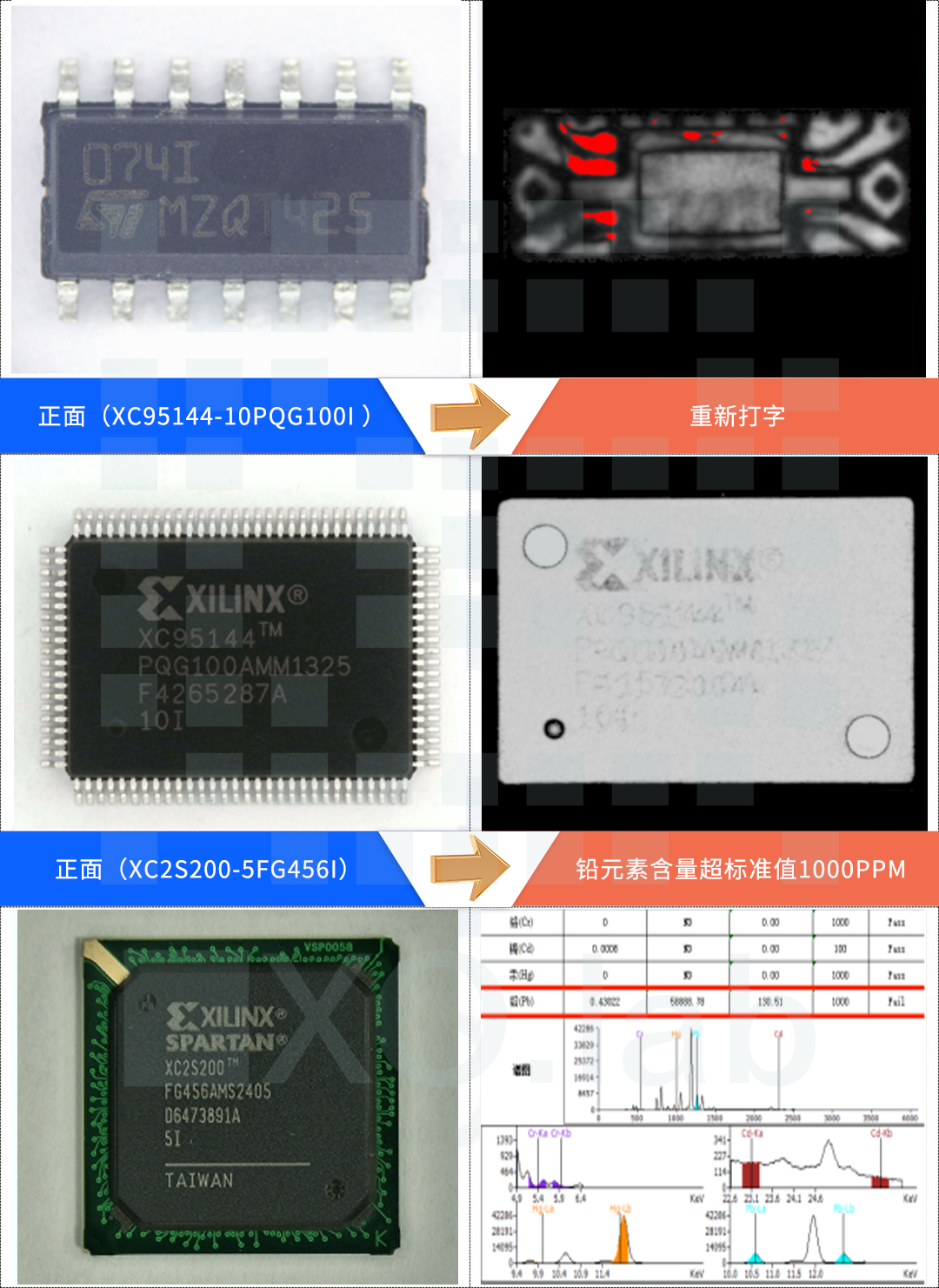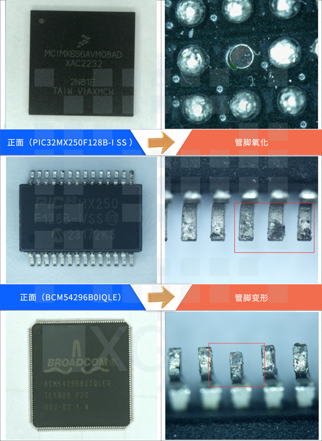 外观检测是指确认收到的芯片数量、内包装、湿度指示、干燥剂要求和外包装是否符合要求。单个芯片的外观检测主要包括:芯片的打字、年份、原产地、是否重新涂层、管脚的状态、是否有重新打磨痕迹、不明残留物、以及厂家logo的位置等。